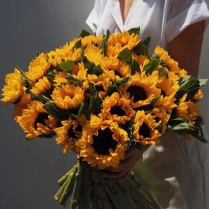 Букет из 19 подсолнухов в стильной упаковке “Солнечное сияние”